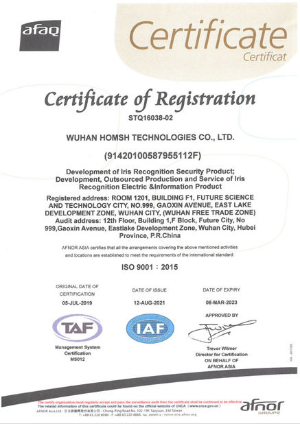 Homsh Technologies a obtenu les certifications du système de gestion de la qualité, des normes du système de gestion de la sécurité sanitaire au travail,Normes relatives au système de gestion de l'environnement et normes relatives au système national de gestion de la propriété intellectuelleIl a passé les tests de qualité des produits par des départements tels que le Centre national de test pour la qualité des produits du système d'alarme de sécurité et de sécurité (Pékin),Centre national d'essais pour la qualité des produits des systèmes d'alarme de sécurité (Shanghai), Guangzhou GRG Metrology & Test co., Ltd, et les laboratoires Bell en France.